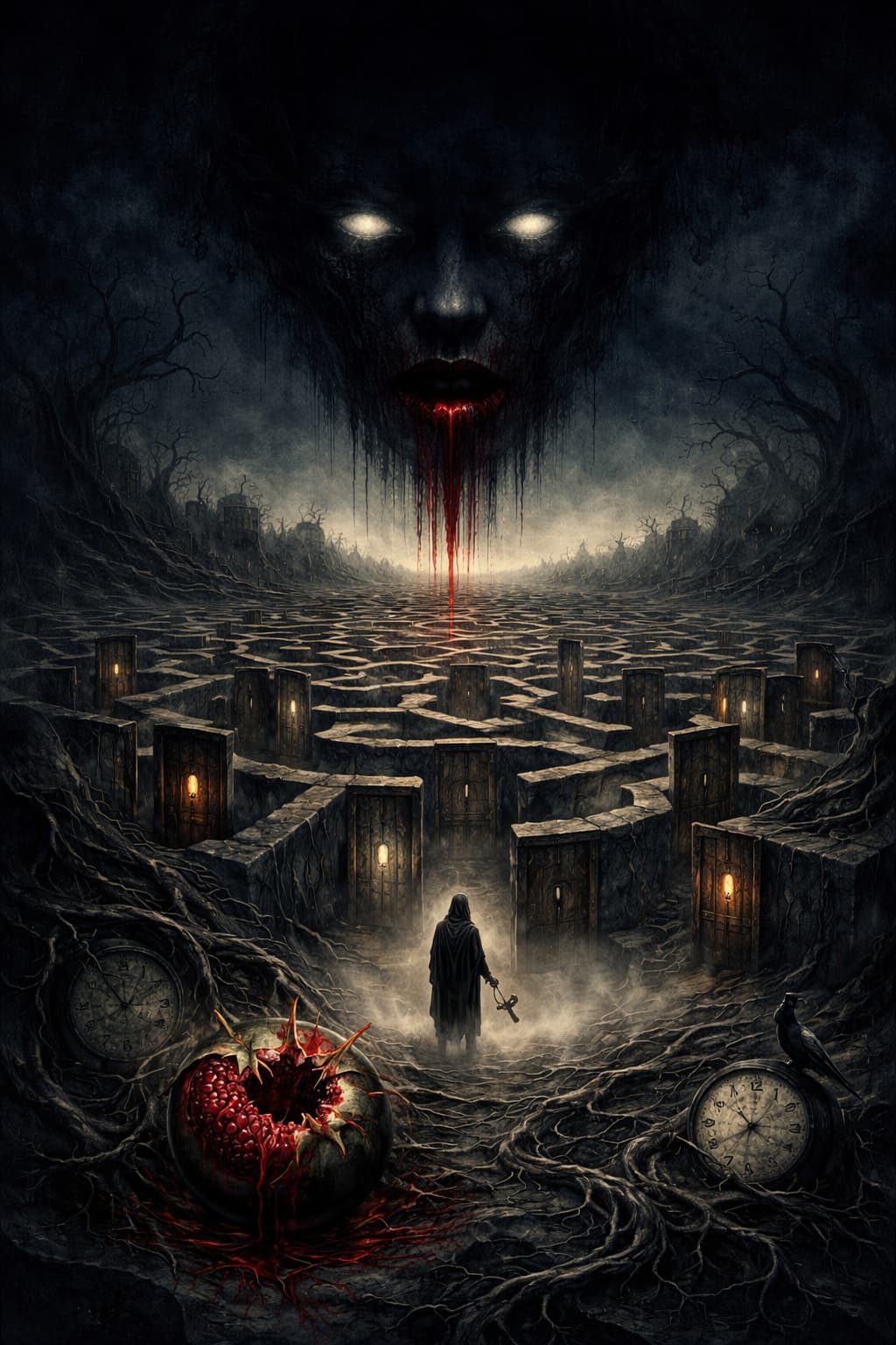 Imagen generada por ChatGPT: El laberinto de sombras y sangre.