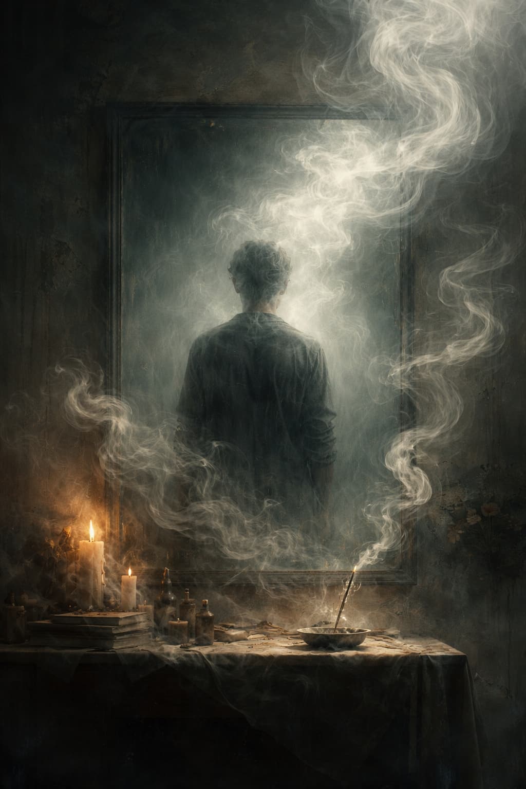 Imagen creada ChatGPT • Figura solitaria y espejo ahumado